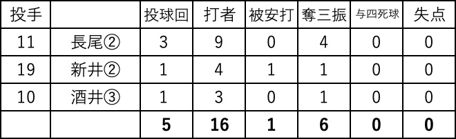 5回裏;二死2.3塁から5番永末右前タイムリーで1点、コールド成立。10x-0