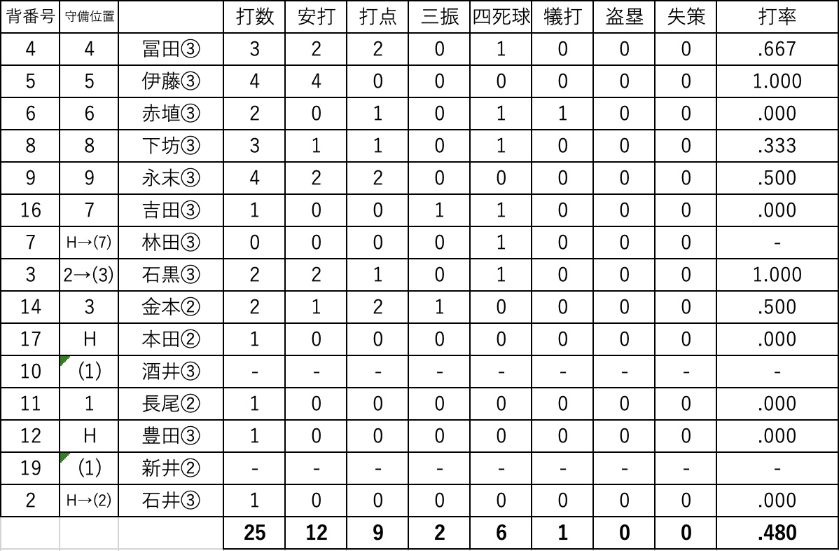 4回裏;一死3塁で4番下坊右翼線タイムリー三塁打、続く5番永末も左中間タイムリー三塁打、さらに暴投でこの回3点追加。9-0