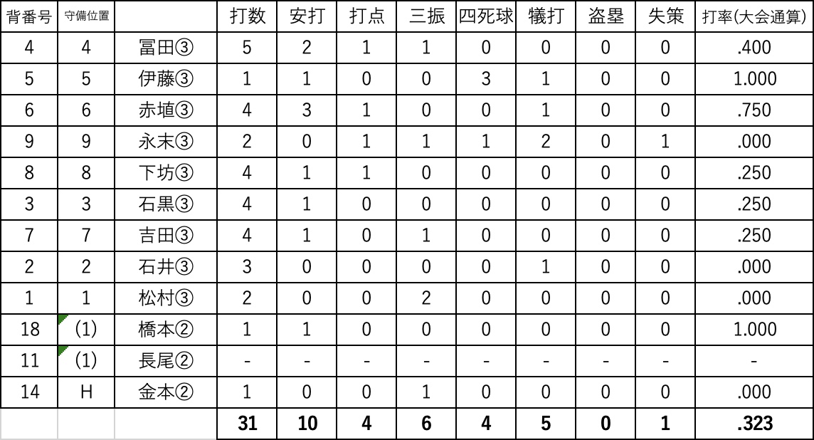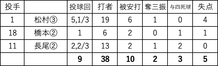 9回表;二死1,2塁と攻め込むも4番永末が中飛に打ち取られ試合終了。4-5