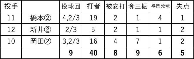 9回表;二死満塁で2番網本右前タイムリー、さらに3番大庭タイムリー内野安打。2点差と迫られなおも二死満塁と続くも最後の打者を空振り三振で試合終了。7-5