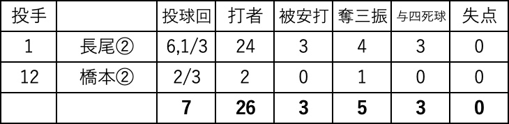 7回裏;一死後二人目の橋本がリリーフ。後続二者を討ち取って試合終了、7回コールド。7-0