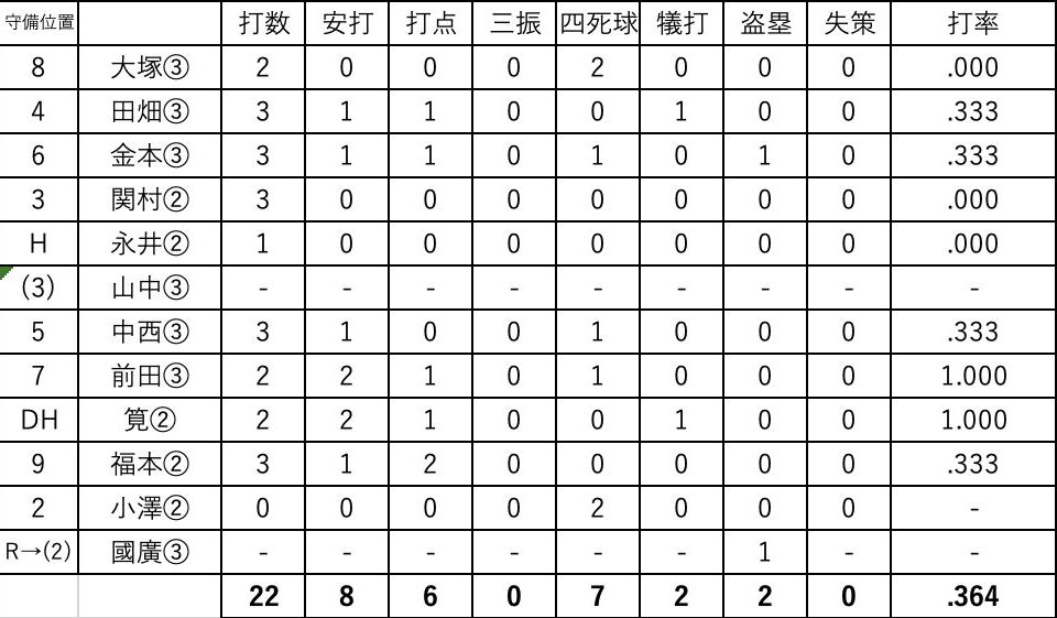 冬を越え約半年ぶりの公式戦も打順一巡目の下位打線から火を吹いた。2回裏一死2,3塁、8番福本の2点タイムリー三塁打で2点先制すると、その後も四死球、暴投、犠飛にタイムリーと繋がり一気に5点。続く3回裏には5番中西、6番前田、7番筧の三連続長打で2点追加し、3回までに5本の長打でコールド点差とした。