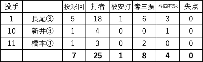 投げては先発のエース長尾が5回1安打6奪三振。130km中盤の力ある直球を中心に無失点とねじ伏せ圧巻の投球。その後も6回新井、7回橋本と両左腕がゼロに抑え無失点リレーで完封。生駒の反撃を許さず7回コールド発進の初戦突破だ。